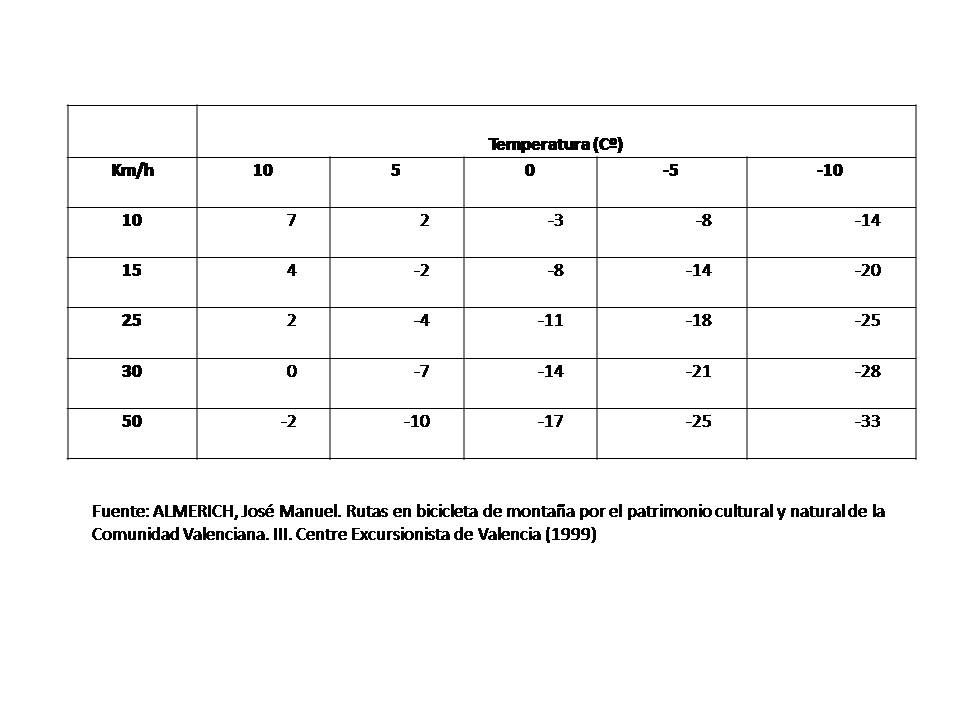 Cuando circulamos en bicicleta, la temperatura, y el frío más concretamente, se convierte en un elemento muy volátil, ya que la sensación de frío que percibimos varía sustancialmente en función de la velocidad a la que circulamos. A continuación os mostramos un cuadro donde se puede apreciar la sensación térmica que percibimos a distintas temperaturas y velocidades. Como se puede observar (pincha sobre la tabla para ampliarla), a 30 km/h la sensación térmica disminuye en 10 Cº como mínimo.
