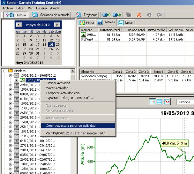 Para empezar deberás descargar la ruta que quieras volver a realizar con el virtual partner en el programa Training Center de Garmin, en la sección Historial. Desde allí, seleccionas la ruta y la conviertes en un trayecto (botón derecho, “Crear trayecto a partir de actividad”).