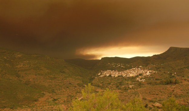 A medida que nos acercábamos a Gátova el cielo se tornaba más oscuro. A las doce del mediodía, el día era noche. Las nubes de humo y agua se mezclaban creando una extraña atmósfera de luz y color. Todo resultaba irreal, excepto el fuego. Cuando llegábamos al punto de inicio, comenzó a llover. Recuerdo que dije: no me gusta pedalear bajo la lluvia, pero hoy lo agradeceré. No llovió lo bastante.