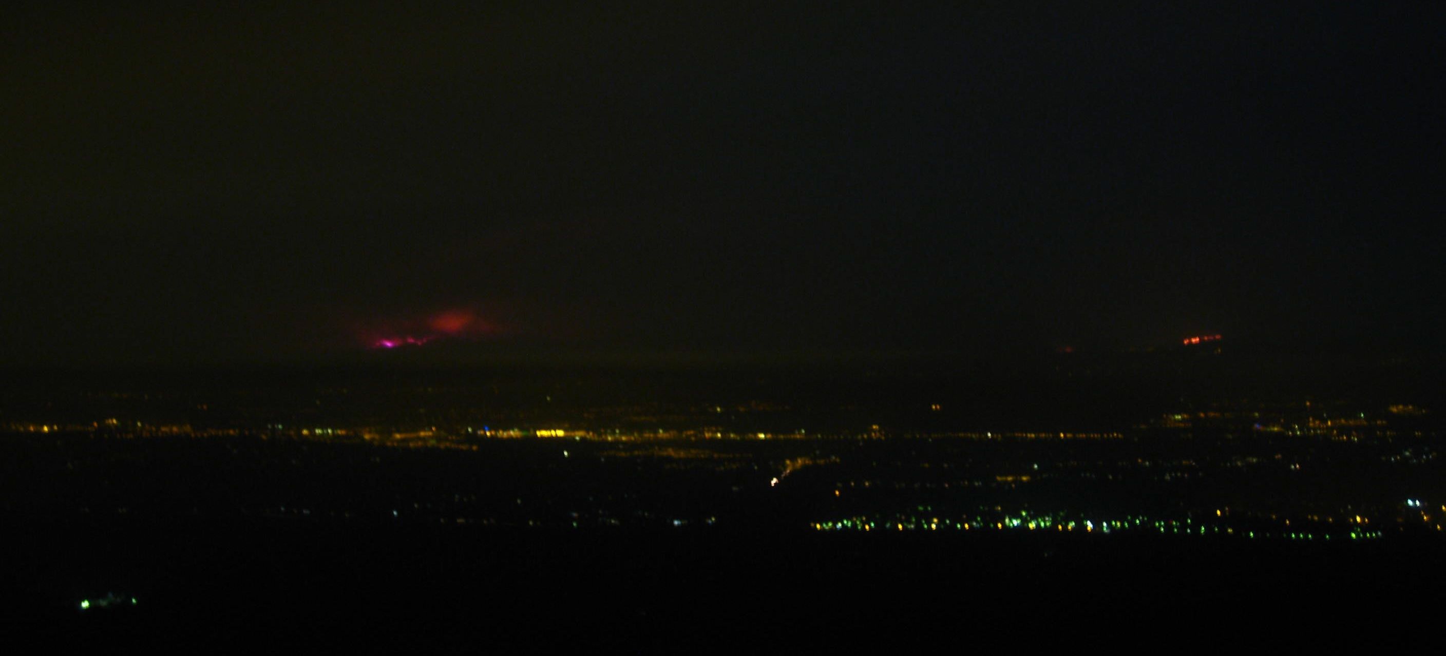 Nada más empezar la ruta, la presencia del incendio todavía era invisible a nuestros ojos. Luego, se hizo patente: mientras subíamos hacia el mirador de Rebalsadores la temperatura era anormalmente alta. Anochecía y parecían las cuatro de la tarde. El cielo se teñía de gris rojizo. Ya en el mirador, el fuego se hizo visible recortando la silueta de unas montañas negras por la noche y por las cenizas.