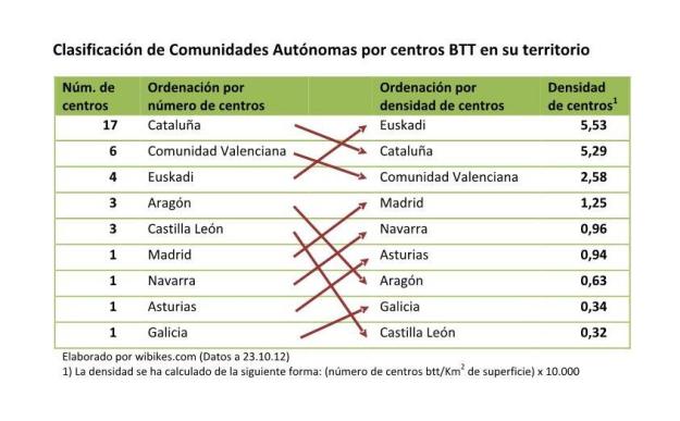 Por Comunidades Autónomas, Cataluña sigue a la cabeza en cuanto a número. Sin embargo, según densidad por kilómetro cuadrado, es Euskadi la que presenta una mejor ratio. La Comunidad Valenciana sube posiciones en términos absolutos, situándose en segunda posición con seis centros. Pero como ya hemos ido analizando en otras entradas (que también encontraréis en la sección de Centros BTT) una cosa es la cantidad y otra la calidad. En nuestro Ranking 2.0 de Centros BTT de 2012, los mejor evaluados en promedio eran los centros de Euskadi, seguidos de los de Aragón y Castilla Léon.